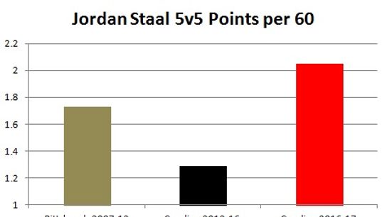 Since arriving in Carolina things have not gone exactly to plan. Staal wanted an expanded role that didn't include being behind Sidney Crosby and Evgeni Malkin. The assumption was that going to another team he would be given legitimate top six minutes. For the first four years in Carolina he has not been provided the role he was expecting. Jordan does play a lot of minutes, but his quality of teammate throughout his Carolina tenure has been very poor. One could argue that Tyler Kennedy and Matt Cooke were better linemates than much of what he has received in Carolina. As a result he has not been a contributing member of Carolina's offense. That is until this year. Here's a snapshot at what his 5v5 points per 60 has looked throughout his career: