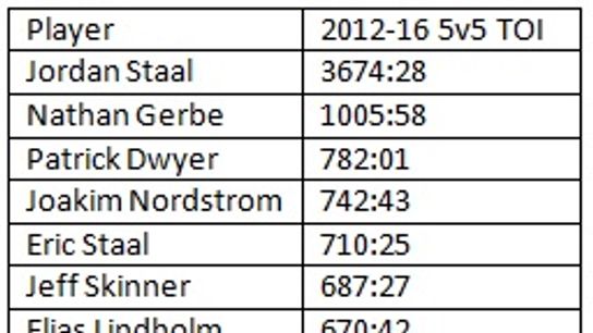This year they finally gave him some legit skill to play with and the results have been very good. The majority of his time has come with Elias Lindholm (280:35) and Sebastian Aho (272:31). Jordan Staal not only leads the team in shot attempt percentage at 56.09% but he is also the team leader in 5v5 points per 60 at 2.05.