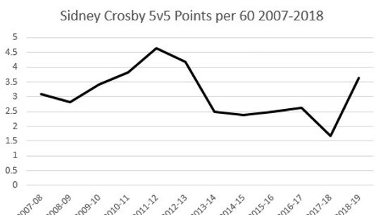 The better paid Pat Brisson client had a great night as well. That client was Sidney Crosby who had a natural hat trick. Sidney Crosby is having an excellent year even by his standards. We only have a 21 game sample at this point, but his 3.64 points per 60 is back in the neighborhood from his prime years. Take a look