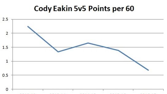 Eakin only scored three goals. His shooting percentage (3.7) was woefully below his 10.6% career average. That will improve. Although, you don't get to a 0.68 points per 60 at even-strength just because your shooting percentage plummeted. Eakin didn't create for others either.