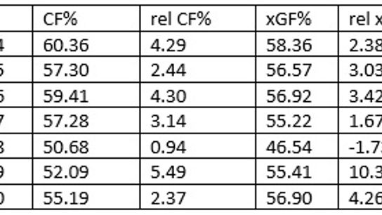 The Los Angeles Kings were a possession juggernaut for a few years so I had some concerns about how high his raw totals were, but when you see he was above average compared to his teammates it speaks to him contributing to the positive results and not being somebody who was just along for the ride. This should also fit in well with a Penguins team that has been putting up very impressive underlying numbers and has been an excellent defensive team. We aren’t talking about a one-dimensional player who will drag what the Penguins are already doing well down with him. Toffoli has a lot of years in the mid-fifties which is really impressive.