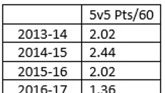 The good news about these numbers is that Toffoli has a few things going for him. These aren’t padded by power play points. Only 48 out of his 273 career points have come on the power play. Also, the Los Angeles Kings have been one of the more inept teams in their ability to generate tangible offense. They have regularly placed in the bottom third and multiple times in the bottom five in GF/60 at 5v5 during Toffoli’s tenure. The Kings have sucked the offensive juice out of nearly every player in recent years. The raw point totals start to look better when you consider the team he played on and the fact they are predominately 5v5 points. Also, his time was not spent with Anze Kopitar one of the few higher end players the Kings have had. Four of his last seven years he has had a points per 60 above 2.0, including this year