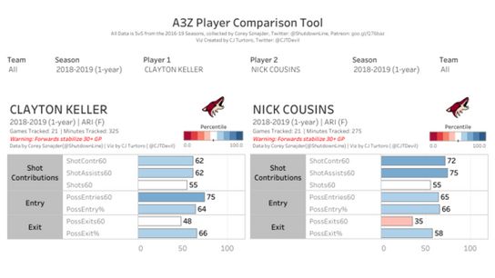 Last year Galchenyuk played the most with Clayton Keller and Nick Cousins. Unfortunately, Ryan Stimson’s viz only goes up to the 2017-18 season at this time so I don’t have the same chart for consistency here. Instead I shift over to CJ Turtoro’s viz which does have shot assist data, but not as individualized as Stimson’s viz.