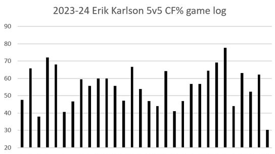 Erik Karlsson found himself with a new defense partner. He is now playing with the struggling Ryan Graves. The result was his worst CF% of the entire season.