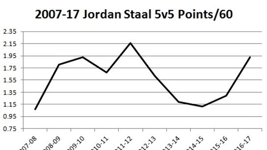While the possession stuff is consistently awesome Jordan Staal's offensive production lends itself to criticism. There have been a few years where his offensive production has been woefully low. Something you definitely can't have at a 6M price point.