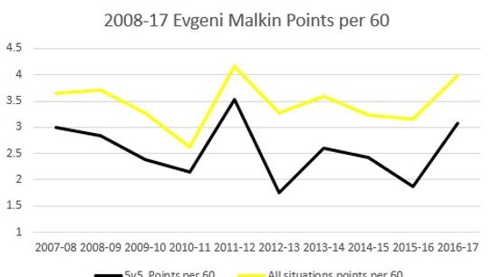 In 2011-12, Sidney Crosby missed a majority of the season and it allowed Geno to have his pick of any wingers. The Evgeni Malkin, Chris Kunitz and James Neal trio was deadly that year. In most years Sidney Crosby and Evgeni Malkin have to share the talent and that’s why I think Geno’s 2016-17 season might be more impressive than the 2011-12 one. Especially when you take into consideration aging trends.