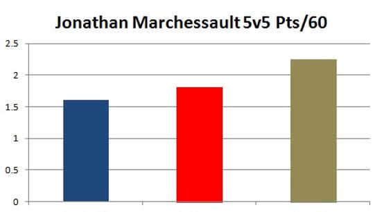 Even his bottom six numbers in Tampa (1.61) would be a great improvement for what the Penguins are currently getting from their forwards. Only Evgeni Malkin (2.01) and Phil Kessel (1.88) are better than that. The fact is that the larger Marchessault's sample grows the more legit it is. While the NHL sample isn't huge when you combine it with his AHL production he has generated offense on a consistent basis as a professional player.