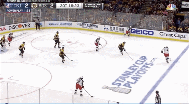 As you can see here, the Blue Jackets are down low on a Bruins power play, not allowing a bumper to skate in and move the puck through the area.