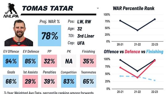 The Penguins have issued multiple PTO’s to players who will be fighting to fill out the lower depths of the roster. There still remains a player available that will shore up one of their biggest needs in the long regular season and that is depth scoring. Tomas Tatar is still out there. Here is what his projection looks like for the 2023-24 season.
