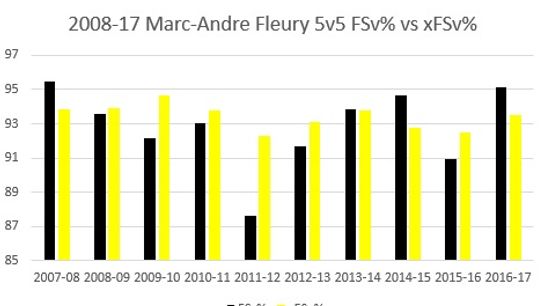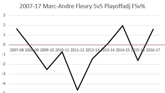 You can see that is hasn't been commonplace over the years for Fleury to outperform his expected save percentage. It is even rarer for him to do this when the sample sizes start to grow. He was very good in 2014-15, but that was a five game series in which the Penguins were dramatically overmatched by the Rangers. If the Penguins win this series Fleury will be starting in at least 14 games for the first time since the 2008-09 season. If he maintains his level of play it will be his finest work in some time.