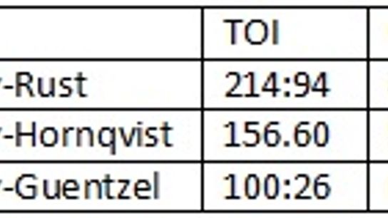 This year Hornqvist's time has been slashed to 304 minutes. Other right wingers include Bryan Rust at 287 minutes and Jake Guentzel with 242 minutes.