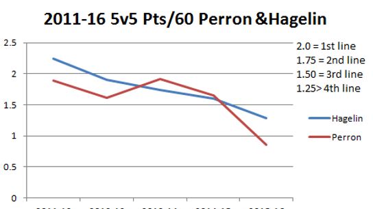 These are two players who have had different paths to the present. Hagelin displayed more consistency and better numbers in the past and has recently seen a decline. Perron has been the opposite. He has improved in areas over the years . Right now their numbers have aligned to be very similar.
