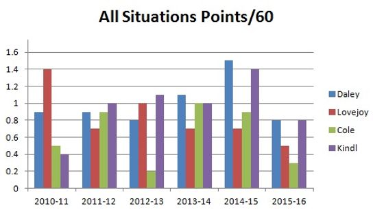 Once again Kindl's offense compares favorably to the Penguins three defenders.