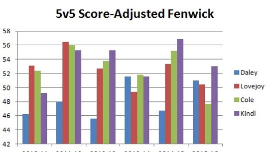 I decided to look into this further. I looked at each player's Score-Adjusted Fenwick, points per 60 in all situations, their, dCorsi, and their HERO charts. Here is what I found