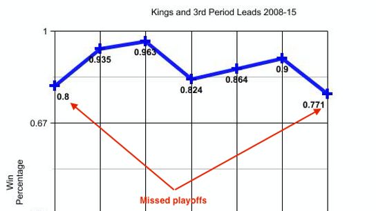 In 2013-14, the Kings held a 27-3-0 record when leading after two periods (.900). In the lockout shortened 2012-13 season they 19-1-2, or an .864 percentage. And finally in 2011-12, a season very similar to this years, they were 28-0-6, good enough for 21st overall and an .824.