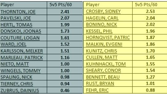 As far as offense at even-strength goes Brent Burns 5v5 points per 60 is great at 1.39. Only Erik Karlsson's 1.52 was better. Kris Letang is impressive at 1.11 but even Marc-Edouard Vlasic bests him at 1.21. That 1.21 is the same rate that PK Subban generates 5v5 offense. Vlasic is quietly a very good offensive player.