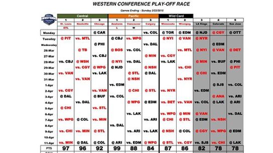 They too like the Jets play 8 games against playoff teams and that includes a game between the Jets and Wild. They have 5 home and 5 away games and are only 1 point up on Winnipeg with 87. If the Wild go 5-5 for 10 points the Jets would move ahead should they manage 12 points. If that were to happen, it matters not what LA and Calgary do as the Jets would certainly control their own destiny and make the post season.