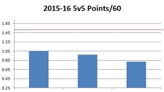 The red line signifies what the average third line caliber player can produce at the NHL level. As you can see these three players aren't quite there yet in the small NHL samples.