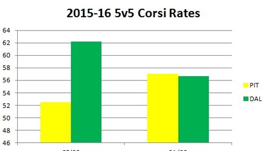Pittsburgh currently has a goal differential of -1 on the year while Dallas is doing a lot better at +18. Dallas is 19 goals better than Pittsburgh despite having similar shot suppression woes. What makes it even more remarkable is that Dallas is the 24th ranked team in EVSV% while Pittsburgh is second overall in the league (.941 vs .921). This is alarming because Pittsburgh won't continue to receive .941 goaltending for the entire year. It is very plausible that Dallas can continue to get by at .921 because that is where league average usually falls each and every year.