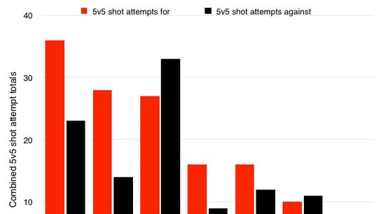 Gomez and Janssen are the only players who have been on the ice for more shot attempts against than for. In Gomez' defense, the team-wide Philadelphia stinker sunk his numbers a bit, and he does have a couple goals to his credit.
