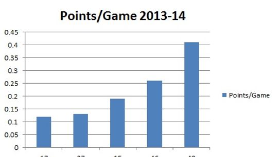 It doesn’t come as surprise, but the points per game totals for 4th line players don’t exactly jump off the page. However, Brian Gibbons is significantly above the others. Part of this has to do with his time up on the Crosby line, but more of it has to do with the fact that he is a better hockey player than the other 4 guys. He is faster, he makes more plays with the puck, and he puts himself in better position to make offensive plays.