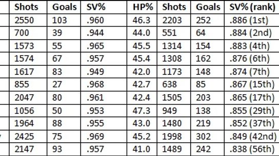 In the chart below you are going to see two sets of data. On the left hand side is the data from shots taken outside of the home plate area. On the right side you will see the data from shots taken from inside of the home plate area. In between both sets of data you will see HP%. That stat indicates the percentage of shots a goalie faced from inside the home plate area.