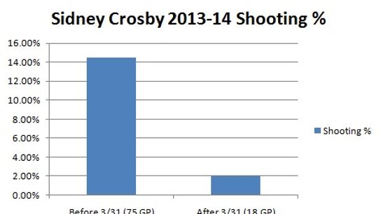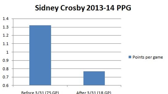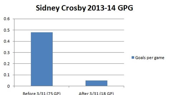 His other goal that game was an empty net tally. Sidney Crosby would not score again until Game 3 against the New York Rangers (14 games). Because of this I have decided to break up Crosby's season into Pre March 31st and post March 31st (including playoffs).
