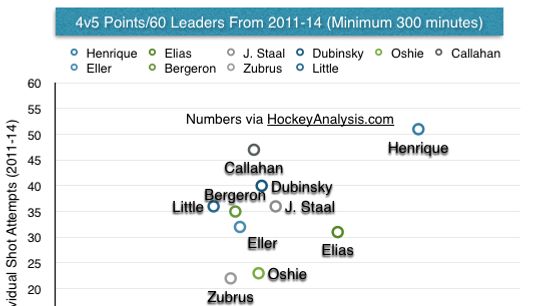 As you can see, Henrique is far and away the most efficient penalty killer in terms of producing points down a man, and it's not even close. He's also first in individual shot attempts.