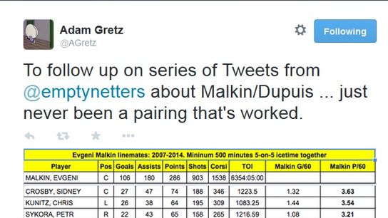 Pascal Dupuis scored both goals for the Penguins in his return to the Crosby line. For now this is probably what is best for the team. The Penguins haven't traded for their new top six winger yet and Malkin needs a little help on his line. Dupuis for whatever reason does not mesh well with Malkin.