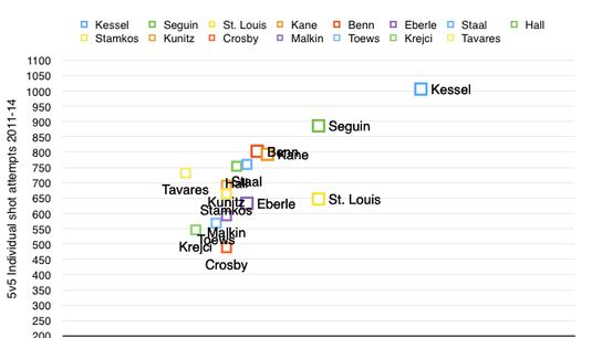 As you'll see in the graph below, he's 1st among all NHL players in individual shot attempts (i.e. individual Corsi) as well as 1st in 5 vs 5 points.
