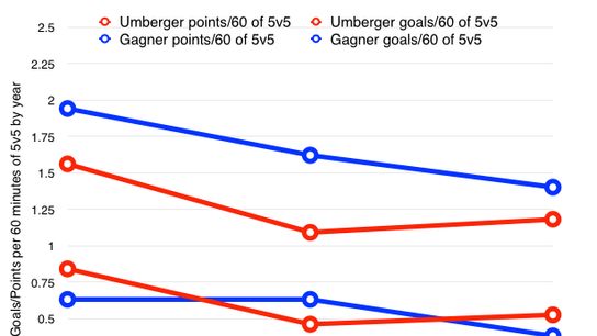 Even with Gagner's well documented so-called struggles, his points per/60 of 5 vs 5 has been higher than Umberger's each of the last three seasons.