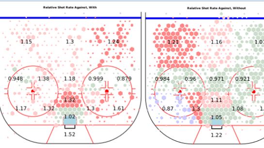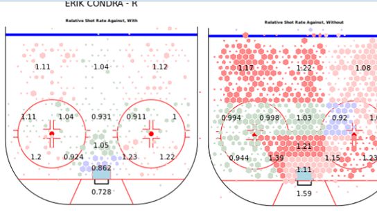 The team was more or less a defensive trainwreck from player to player, but I thought it'd be interesting to pull out numbers for the departed Jason Spezza and current forward Erik Condra -- who basically has only defensive value. If the shot location suspicions are accurate, Spezza should've conceded far more shots in dangerous areas; Condra less so. Does it hold?