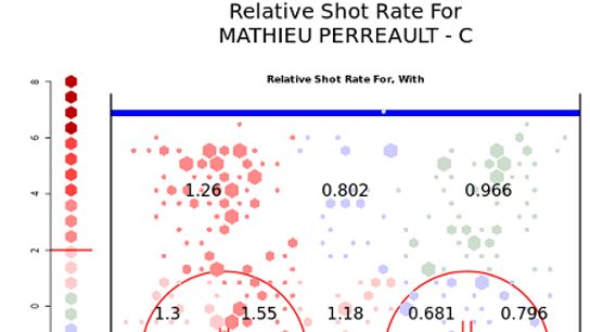 I've been playing a bit with an R package that allows for easy display of shot coordinates for/against. To kind of illustrate the above examples, let's quickly look at two players who would seem to fit the (a) and (b) criteria -- Mathieu Perreault and Zdeno Chara.