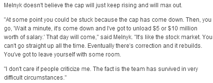 29 NHL teams are preparing for an escalating salary cap this summer and beyond. In Ottawa, the thought process is a bit different. There's a belief that, at some point in the foreseeable future, the salary cap is going to come crashing down. In this theory, teams will need to dust off $5MM-$10MM in salary to satisfy the hard cap requirements.
