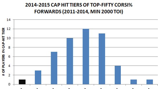 That said, he still comes at a massive, massive discount to Ottawa. A perfect player for a team strapped on a tough internal budget. To sort of illustrate this, I went ahead and grabbed next year's cap hits for the top-fifty Corsi% forwards from 2011-2014.