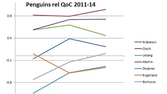 Here is a chart that shows the past 3 seasons of rel QoC for the Penguins. I have used players who have been on the roster for the past 3 seasons: