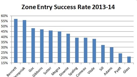 Pittsburgh's zone entry success percentage for the bottom six as whole was 42.1% in 2013-14.