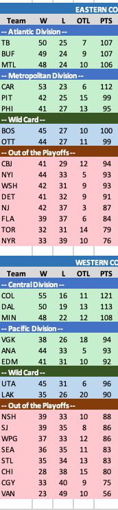 They we're very impressive last night in Winnipeg to push themselves to 94 points. And you'd love to think that's enough to get them into the playoffs… but unfortunately for them, it's probably not. Cause here’s the catch—and it’s a massive one: They lose every tiebreaker.