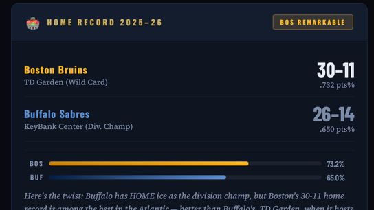 Buffalo has home ice as division champ, but Boston's 30-11 home record is better. The Bruins went 3-1 vs. Buffalo in the regular season. A loud TD Garden in Games 3 and 4 could be where this series is decided — if Boston can hold serve at KeyBank first.