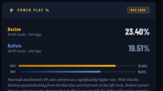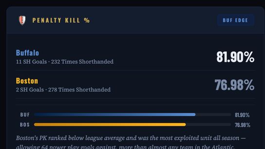 Boston's power play (23.40%) is significantly better than Buffalo's (19.51%), but Boston's penalty kill (76.98%) is a liability. Buffalo killed 81.90% of penalties and scored 11 shorthanded goals. The team that wins the special teams battle likely wins the series.